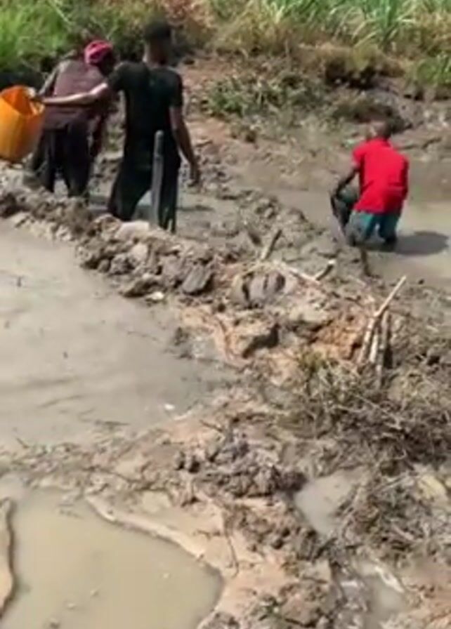 three people working in a muddy field. One person is wearing a red shirt and blue shorts, kneeling in the mud and using a black container to move mud. Another person, wearing a dark shirt and long pants, is standing in the mud while the third person, wearing a head covering and dark clothing, carries a yellow bucket through the mud. The field is uneven and has several puddles. In the background, there is tall green vegetation. The overall impression is of manual labor being performed in a wet and muddy environment.
