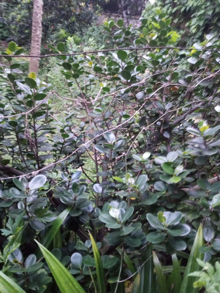 This image displays a dense arrangement of green vegetation, located in Ivato, Madagascar. The foreground and midground are dominated by a multi-stemmed bush featuring numerous small, ovoid, dark green leaves on slender branches. Interspersed within this foliage are several thin, grey, taut wire strands, consistent with a fence line, traversing horizontally across the mid-section of the frame. In the immediate foreground, elongated, lighter green blade-like leaves are visible. The background reveals a lighter-colored tree trunk on the left and a blurred mass of additional green trees and vegetation, indicating a heavily planted or natural outdoor environment. The ground visible through gaps in the foliage appears to be covered with sparse green growth. No individuals or specific activities are depicted.