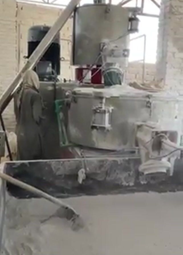person standing near a large industrial mixer inside a building with a corrugated metal roof. The person is wearing a long coat and head covering, and is standing next to the mixer's control panel. The mixer is a large, cylindrical tank with a smaller tank above it, connected by a pipe. A large motor is attached to the mixer. The mixer is surrounded by a trough filled with a white, powdery substance. A long-handled tool is partially visible, lying in the trough. The environment appears to be a production or manufacturing facility. The scene is brightly lit by natural light coming through the windows.