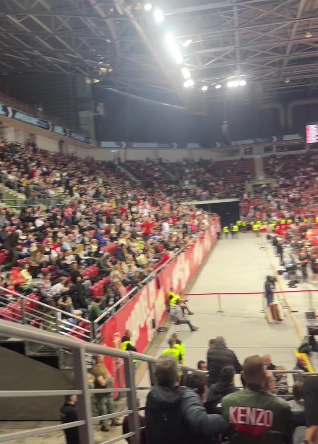 packed basketball arena with fans filling the stands, predominantly dressed in red and white. The game is about to start, and the players in red uniforms are warming up on the court. The arena is well-lit with overhead lighting, and there are large video screens displaying the score and advertisements. Security personnel in bright yellow vests are stationed near the court. A man wearing a jacket with "KENZO" on the back is among the spectators. The atmosphere is buzzing with anticipation for the game.