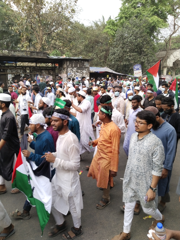 large crowd of people, mostly men, gathered on a street in Dhaka, Bangladesh, near the coordinates 23.738, 90.399. The majority of the people are wearing traditional South Asian clothing. Many are holding Palestinian flags and banners, and there are signs reading "Qassam," a name associated with Hamas, a Palestinian militant group. There are trees and a large building with a closed gate in the background. The scene appears to be a rally or demonstration, with people walking and carrying flags. The atmosphere is solemn and focused.