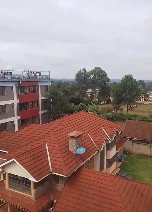 residential area from an elevated perspective, likely a balcony. In the foreground is a two-story house with a red tiled roof, a chimney, and a satellite dish. Beyond it, there is a green lawn enclosed by a brick wall. Several trees are present. In the background, there is a school with a sports field where some people are visible. The sky is overcast.