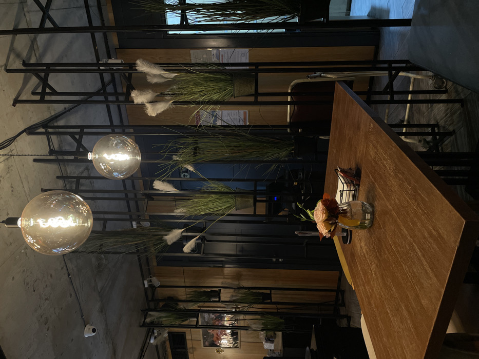 This image depicts the interior of an establishment in Batumi, Georgia, characterized by a modern industrial aesthetic. The ceiling is exposed concrete with visible electrical conduits and a white surveillance camera mounted in the upper left. Two large, spherical pendant lights with exposed filament bulbs hang from the ceiling, emitting a warm, amber glow. In the foreground, a rectangular wooden table with a visible grain and textured surface is positioned. On the table, a clear glass vase contains a small bouquet of cut flowers, consisting primarily of pink and peach-toned roses. Adjacent to the vase, a black wire basket holds napkins. The midground features a decorative partition constructed from black metal framework. Integrated into this framework are multiple potted plants, predominantly tall, thin-leaved grasses, several of which feature white, feathery plumes. Behind the partition, the walls are paneled with light-colored wood. To the right, a chair with a light-colored metal frame and dark upholstery is partially visible, positioned against the partition. An opening on the far right reveals a brightly lit area with a visible blue light source. No individuals are present or actively engaged in the scene.