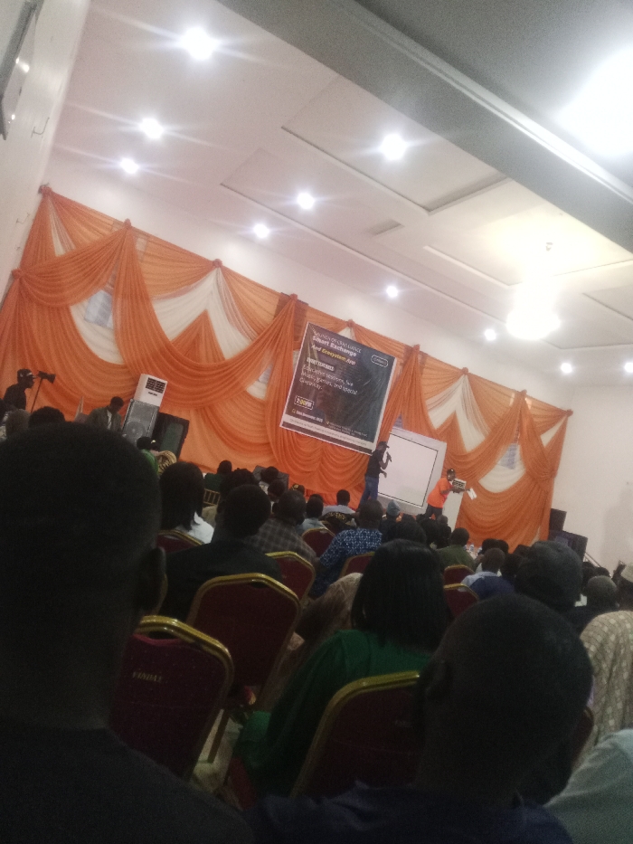 An indoor event shows a crowd seated in rows of chairs facing a stage decorated with orange and white curtains. A large banner advertises a “Smart Exchange and Ecosystem App.” Two individuals are on stage, one in an orange outfit standing at a podium and the other, clad in black, standing near a whiteboard. The room is brightly lit with numerous overhead lights. Audience members are diverse in attire, suggesting a general audience.