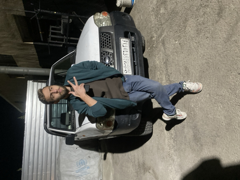 A man leans against the rear of a white pickup truck, making a peace sign with his left hand. He wears jeans, a brown shirt, and a green jacket. The truck has a dark front grill and a license plate with Arabic script. The setting appears to be outdoors, possibly at night, with a concrete surface visible. A structure with a corrugated metal exterior is partially seen on the left side of the frame.