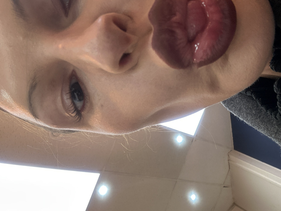 The image is a low-angle close-up of a person's face. The face is angled downward, highlighting the nose, eye, and lips. The lips are full and have a glossy, dark red color. The eye is open, revealing a blue iris and long lashes. The skin appears smooth with a subtle sheen. Above the person, a bright, white ceiling with recessed lights can be seen. A gray garment is visible on the right side of the frame.