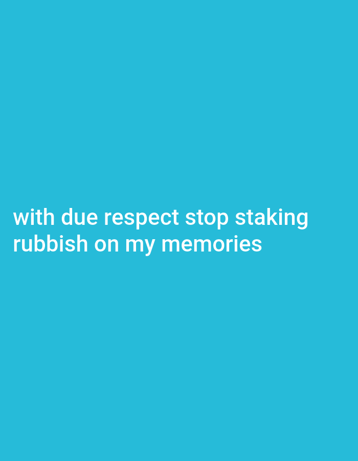 This image is a digital graphic featuring a solid teal background. Overlaid in white, sans-serif text, centered towards the bottom third of the frame, are two lines of text: "with due respect stop staking" followed by "rubbish on my memories". No physical location, individuals, subjects, objects, actions, interactions, or discernible environment in the city of Nwofia, Nigeria, or elsewhere, are depicted. The scene is purely textual on a colored digital canvas.