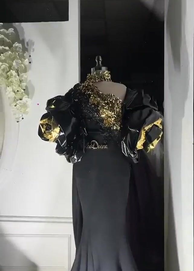 several mannequins with dresses. The first mannequin has a black dress with a mermaid style skirt. The dress has a golden sparkly design on the top and around the neck. The mannequin also has large, black sleeves with gold accents. There is a small silver belt around the waist. The second mannequin has a similar shape and design, but the top is black with gold trim and the bottom is silver in a geometric pattern. The third dress is black with sequins. The top of the dress is silver. The mannequin has a black feathery shawl. There are white decorations around the mannequins.