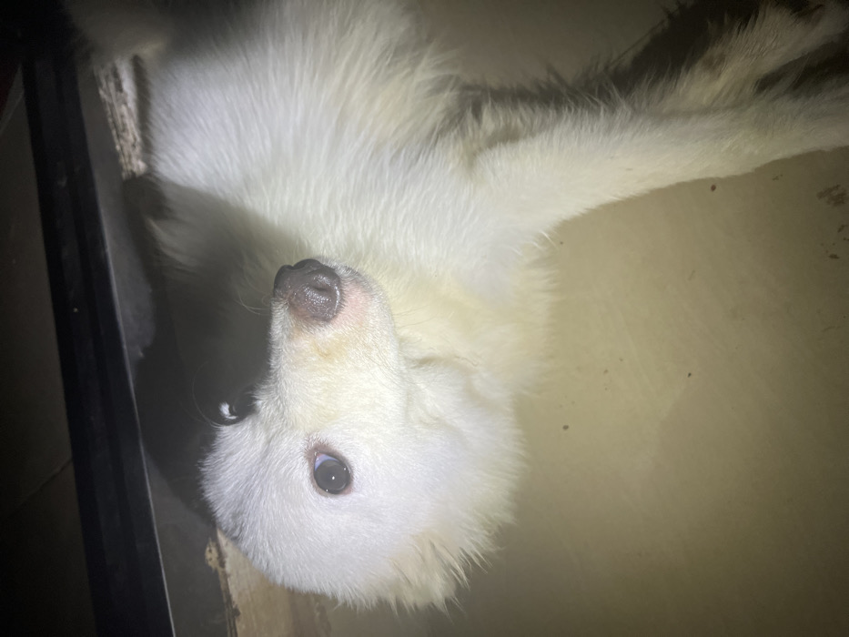 - "The scene, located in Ikot Ekpene, Nigeria, captures a white-furred dog lying on a light-colored, possibly tiled or concrete, floor" by FM-1vJDR2, licensed under CC BY 4.0