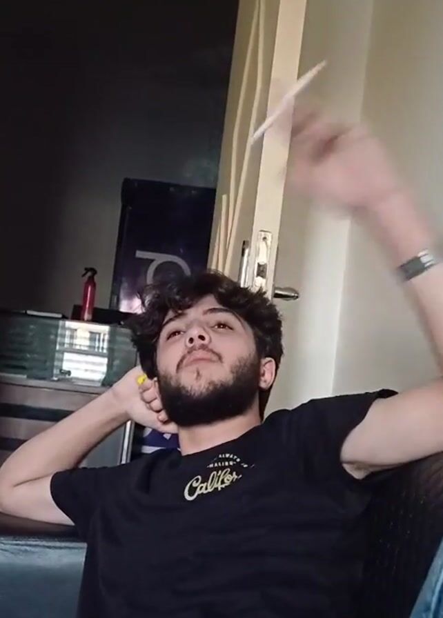 A young man with dark, curly hair and a beard reclines on a black sofa. He wears a black t-shirt with gold lettering, white shorts, and a watch on his left wrist. He is smoking a cigarette, holding it between his fingers. He looks up and exhales smoke. The background includes a partially open door leading to a darker room, a desk or counter with various items on it, and a white wall. The overall lighting appears to be indoor and somewhat dim.