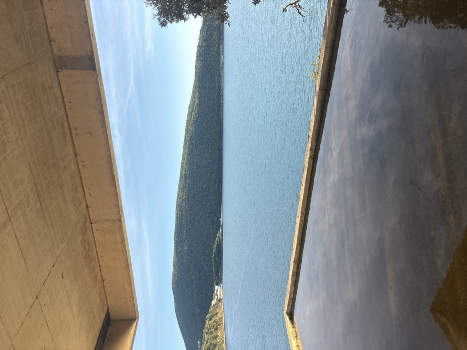 This image presents a coastal landscape in Kruče - Kërruçi, Montenegro, viewed from beneath an architectural structure. The scene is framed at the top by a textured, unfinished concrete ceiling and a horizontal concrete beam, indicating an overhang or balcony. In the immediate foreground, a rectangular, shallow basin containing dark, reflective water is visible, bordered by concrete edges. The water surface mirrors the sky and portions of the overhead structure. Beyond these foreground elements, a wide expanse of calm, blue-green sea dominates the mid-ground. Along the left shoreline of the bay, a small cluster of white and light-colored buildings is visible, situated at the base of a green, tree-covered slope. The distant background is characterized by a prominent, horizontally extending hill or mountain, densely covered in green vegetation. The sky above is clear and light blue with minimal cloud cover. A segment of dark green foliage and bare branches from a tree or large shrub is present on the far right edge of the frame. No individuals or active subjects are depicted.