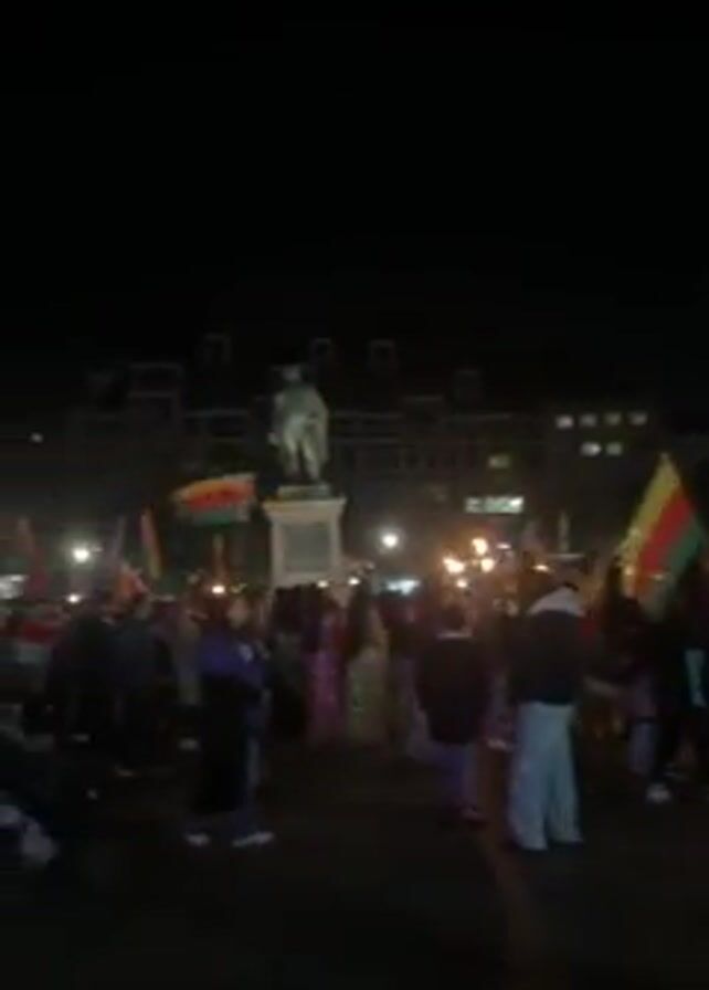 nighttime gathering of people in a city square. The crowd is holding flags and torches. A statue stands prominently in the background. Buildings surround the square, and streetlights illuminate the scene. People are walking around and generally appear to be involved in a demonstration or celebration.