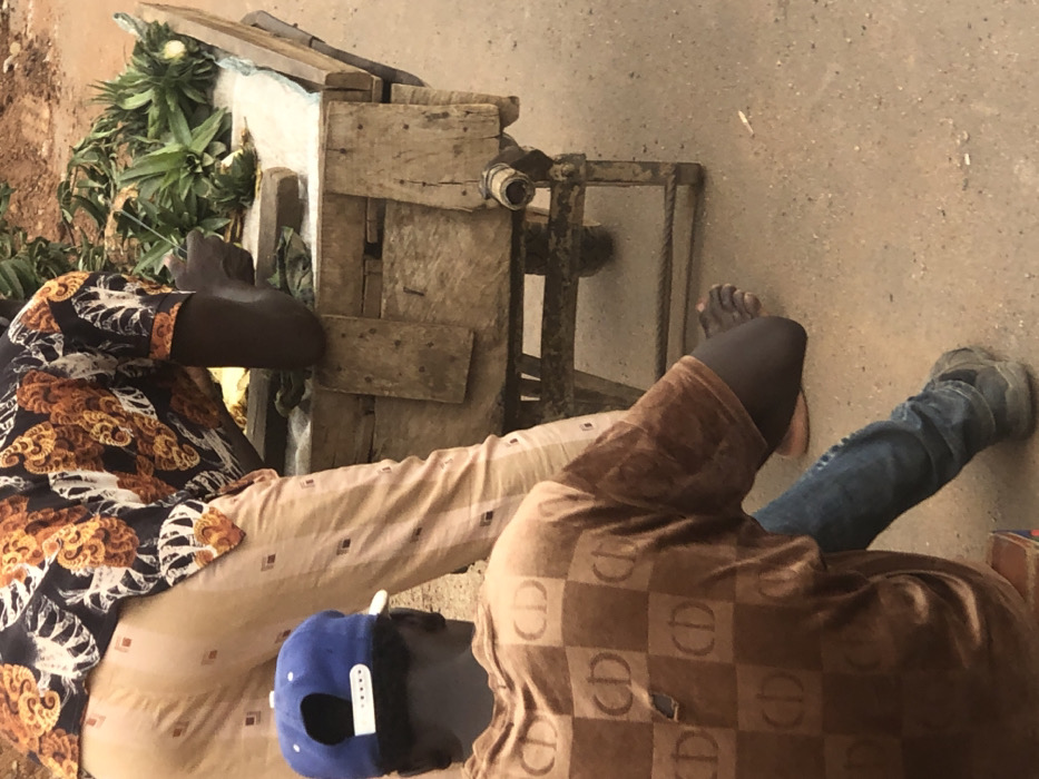 Two people lounge beside a weathered wooden structure, potentially a makeshift shop. One person wears a patterned top with light pants and a blue baseball cap, while the other is in a brown patterned shirt, blue jeans, and one shoe. Lush greenery grows beside the wooden structure. The scene is captured from a high angle, creating a casual, everyday moment.