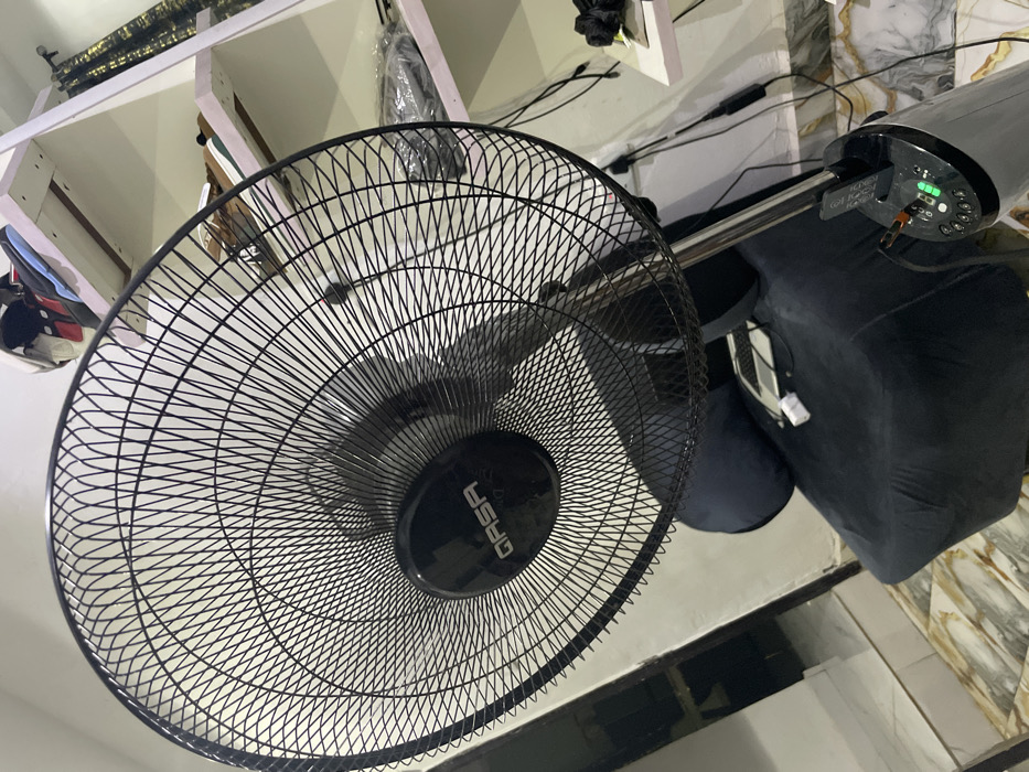 A close-up shot focuses on a black electric fan with a dense, wire mesh guard. The fan's central hub displays the brand name "GASA." A metallic pole extends from the fan base towards the top right, where it connects to the fan's motor. The base rests on what appears to be a tiled floor. In the background, partially visible are items on shelves, a black bag, and power cords, suggesting a cluttered indoor environment.
