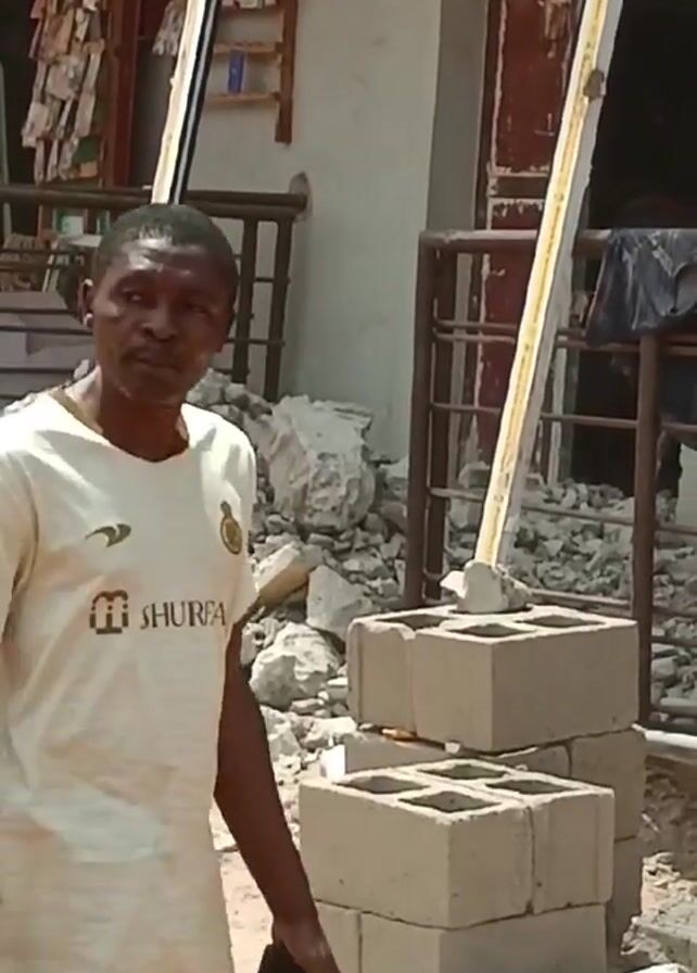 The scene depicts a partially demolished or deconstructed structure, possibly a building. Debris, including loose rocks and fragments, is scattered on the ground. A stack of concrete blocks is positioned in the foreground. Leaning against the debris is a rectangular frame, possibly a door or window frame, with a white or light-colored border and a black interior outline. A man walks past the frame, glancing toward the camera as he passes. He is wearing a white t-shirt with a logo. Behind the debris and frame, there is a building with a visible shelf and what appear to be items for sale or display. Some metallic railings are also visible. The environment suggests ongoing construction, renovation, or demolition work.