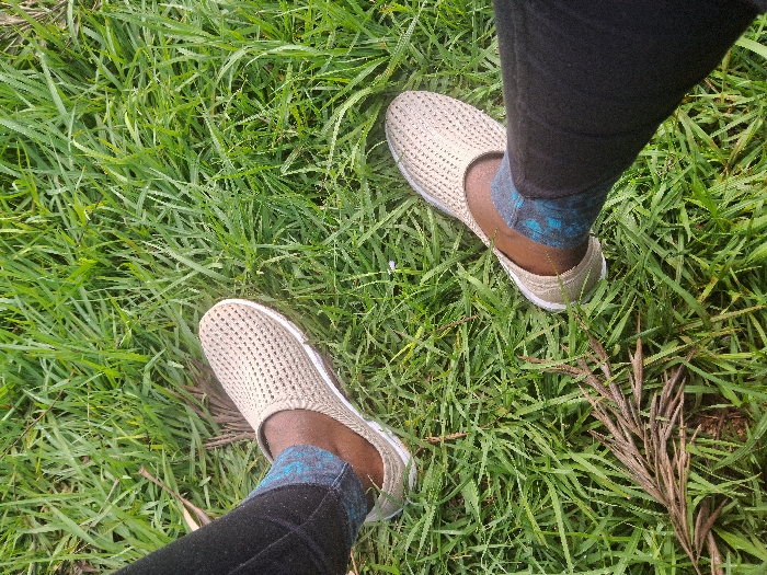 An overhead view captures the lower legs and feet of a person situated on a bed of green grass in Muthambi ward, Kenya. The individual wears dark-colored trousers or leggings that extend to the ankles, revealing blue socks with a light-colored geometric pattern. Light beige, woven-texture slip-on shoes with white soles cover both feet. The right foot is positioned slightly forward and to the right, while the left foot is slightly behind and to the left. The ground is covered by dense, vibrant green grass, interspersed with a few blades appearing slightly drier. A dried, brown, multi-branched piece of vegetation, approximately 15-20 cm in length, lies on the grass between and slightly below the feet.
