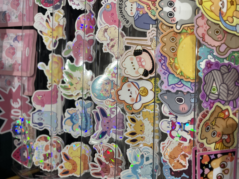 display of colorful, holographic stickers. Many feature cute cartoon characters and food items like tacos. There are also numerous Pokémon stickers, particularly Eevee and its evolutions. A price tag reading "10€" is visible. The stickers are arranged in transparent containers, possibly for retail sale. Some stickers include phrases like "PARTY TIME," "FOR YOU," "BEST BUN," and "BUSINESS."