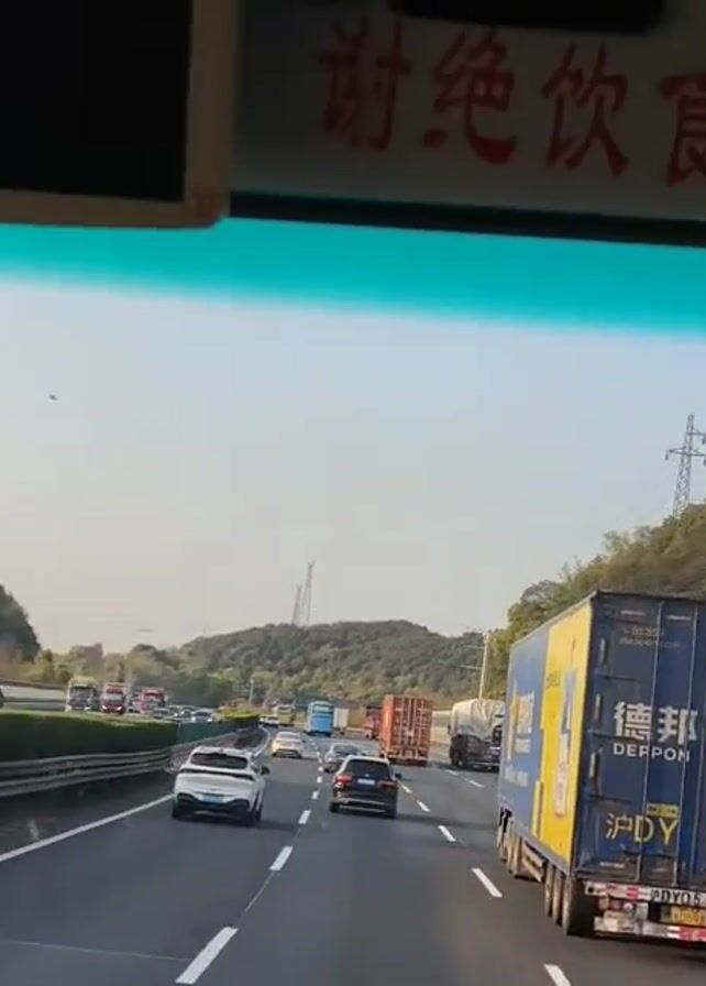 view from inside a vehicle, looking out onto a busy highway. Several lanes of traffic are visible, including cars and large trucks. A blue and yellow "DEPPON" truck is prominently seen in the right lane. The highway is surrounded by green, hilly terrain under a clear sky. The sign above the windshield has Chinese characters. Traffic appears congested with vehicles moving at slower speeds. No people are visible inside the vehicle, only the road and other vehicles ahead.