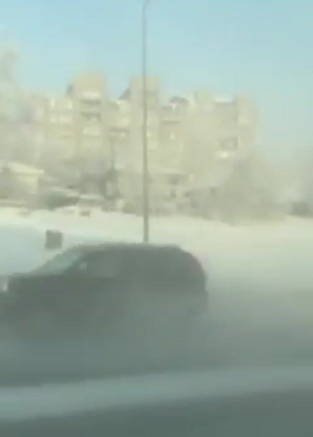 The video depicts a wintry scene viewed from inside a moving vehicle. Snow covers the ground and trees, with buildings visible in the background. The sky is a pale blue. A road is visible in the foreground, and cars pass by. The overall atmosphere is one of cold and overcast weather.