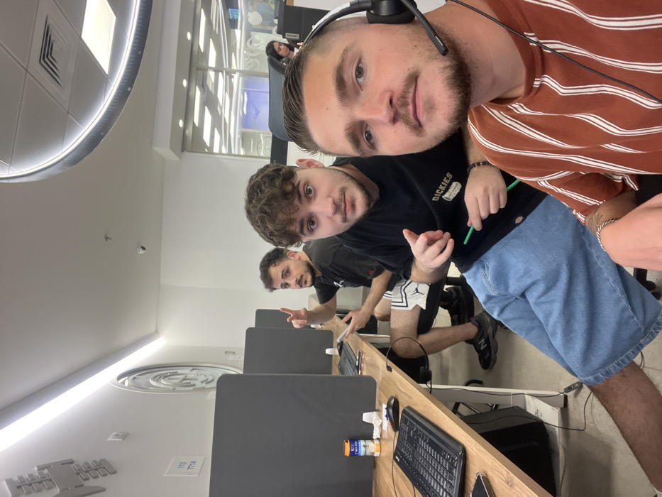 The image depicts an indoor office environment, specifically an open-plan workspace or call center, located in an unknown commercial building within the city of Unknown, Unknown. Three males are prominently featured in the foreground and middle ground, with a fourth individual, a female, partially visible in the far background. In the immediate foreground, a male with short brown hair, a mustache, and a short beard wears a striped orange and white t-shirt and a black headset with a microphone, looking directly at the camera. Beside him, in the middle ground, another male with curly brown hair, a slight mustache, and a beard, wears a black "Dickies" t-shirt and light blue denim shorts, also looking at the camera while holding a green straw and pointing his right index finger forward. Behind these two, to the left, a third male with dark wavy hair, a mustache, and a beard, in a dark t-shirt and black basketball shorts, is seated at a workstation, making a peace sign with his right hand while holding a smartphone. He is positioned behind a dark grey desk partition. The office space features rows of wooden desks with dark grey partitions. A black keyboard is visible on the desk in the left foreground, alongside a blue-and-orange container and some crumpled paper. Overhead, the area is illuminated by long linear and large circular fluorescent light fixtures. The white walls display metallic, abstract decorative elements and a label marked "113 / 7714." A small black security camera is mounted on the white ceiling. In the distant background, beyond a glass partition, more office workstations and blurred figures are discernible, including the female individual seated at a desk.