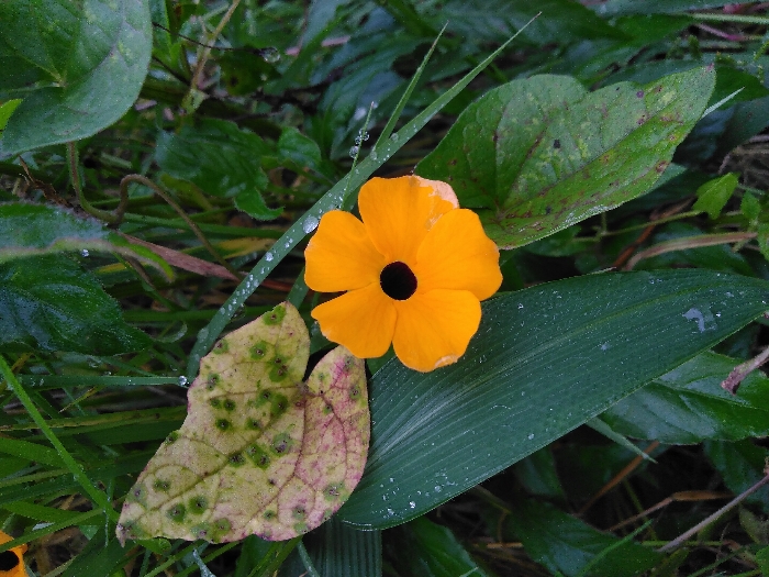 This close-up vertical image depicts a single, vibrant orange Black-eyed Susan vine (Thunbergia alata) flower with a prominent black central disk, situated amidst a dense natural array of green foliage. The scene is located in the city of Chan-Nua, Laos. The flower, featuring five petals, shows slight discoloration on the upper left edge of its uppermost petal. Below the flower lies a long, dark green, blade-like leaf. To the upper left, a larger, paler yellowish-green leaf exhibits numerous irregular dark green spots and areas of reddish-purple pigment, indicative of either senescence or disease. The surrounding environment consists of various green leaves and stems of differing shapes and sizes, indicating lush vegetation. Multiple clear water droplets are visible on the surfaces of the leaves and grass blades, suggesting the presence of dew or recent rainfall. There are no human subjects, animals, or man-made objects present, and no discernible actions or interactions are occurring within the frame.