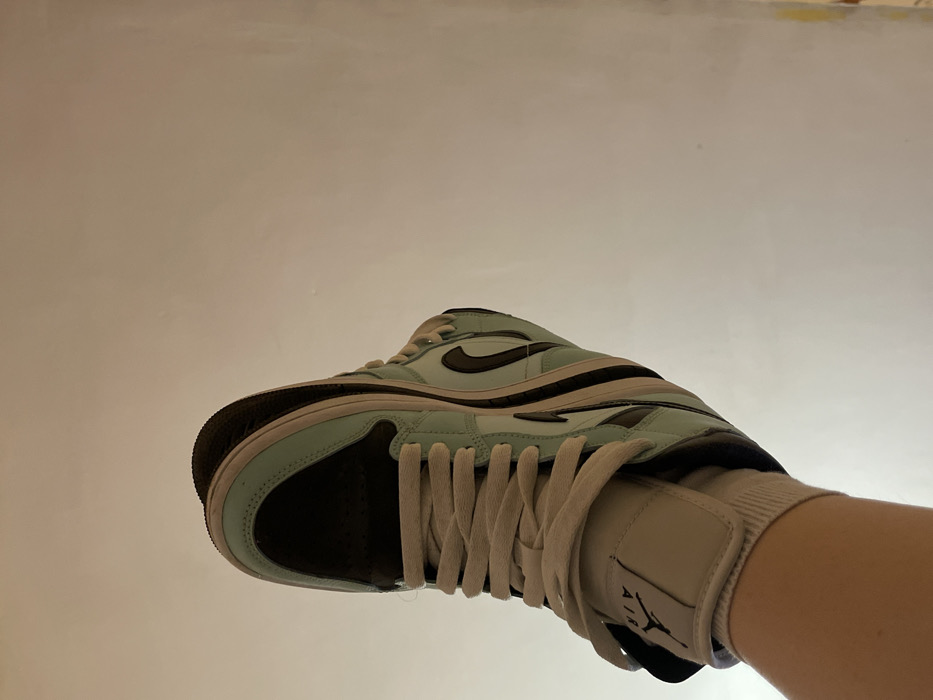 A human leg, partially visible, is depicted wearing a mint green, black, and white Nike Air Jordan sneaker and a white sock