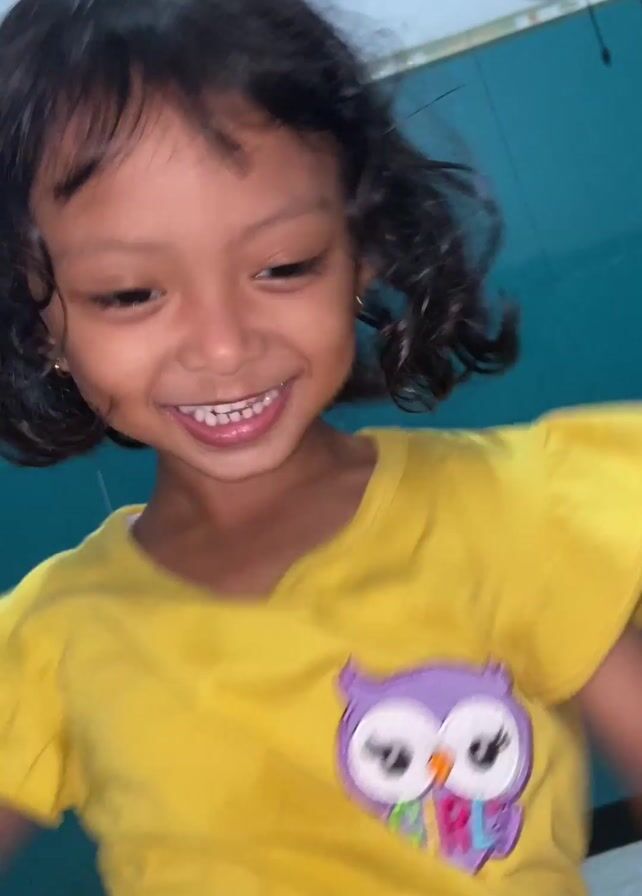A young girl is joyfully dancing to music in a room. She is wearing a yellow t-shirt with an owl on it, and leopard-print shorts. Her hair is short and wet. She is smiling brightly and moves energetically to the beat of the music. A yellow toy duck is visible on the floor near a blue wall.
