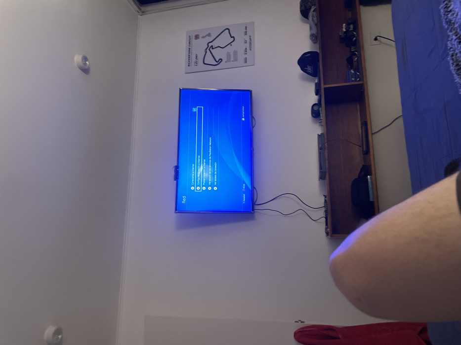 A wall-mounted flat-screen television displays a menu screen with Spanish text relating to network connections. Above the TV is a poster of Silverstone Circuit. To the right of the TV, a narrow, tall wooden shelving unit holds assorted items including hats, gaming accessories, and what appears to be a game console. A blue bed is partially visible on the right edge. A person's arm is prominently featured in the foreground.