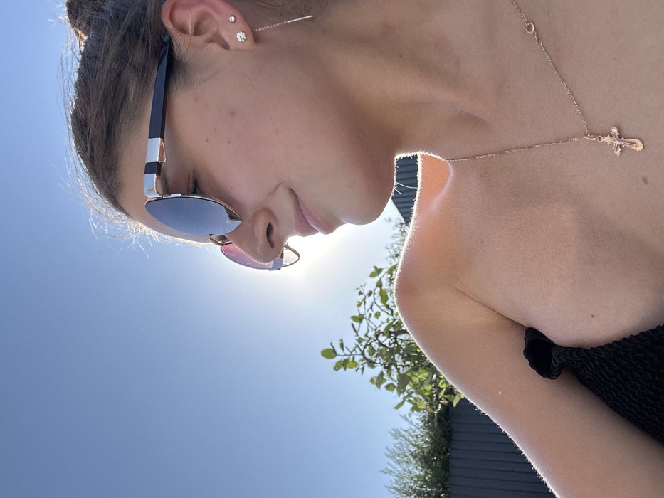 The image captures an outdoor scene in Shevchenkove, Ukraine, depicting the upper torso of a single individual, a young female, observed from a slightly elevated, side-profile perspective, facing towards the right. She wears dark, reflective sunglasses with black and metallic frames, obscuring her eyes. Her dark hair is pulled back, partially visible. The subject's left ear is visible, adorned with two stud earrings—a larger clear stone and a smaller silver stud—and a longer, thin silver earring dangling from the lower piercing. A thin gold-colored chain with a small crucifix pendant is visible around her neck and on her chest. Her shoulders are bare, and faint reddish marks are present on the neck and shoulder area. A section of dark, textured fabric, likely swimwear, is visible on the left side, near the subject's arm. The environment consists of a clear, bright blue sky dominating the upper frame. A strong light source, presumed to be the sun, is positioned behind and to the right of the subject, creating backlighting and a visible lens flare. In the background, green foliage from a tree or bush is visible to the left, with a dark, possibly corrugated, fence running horizontally behind it.