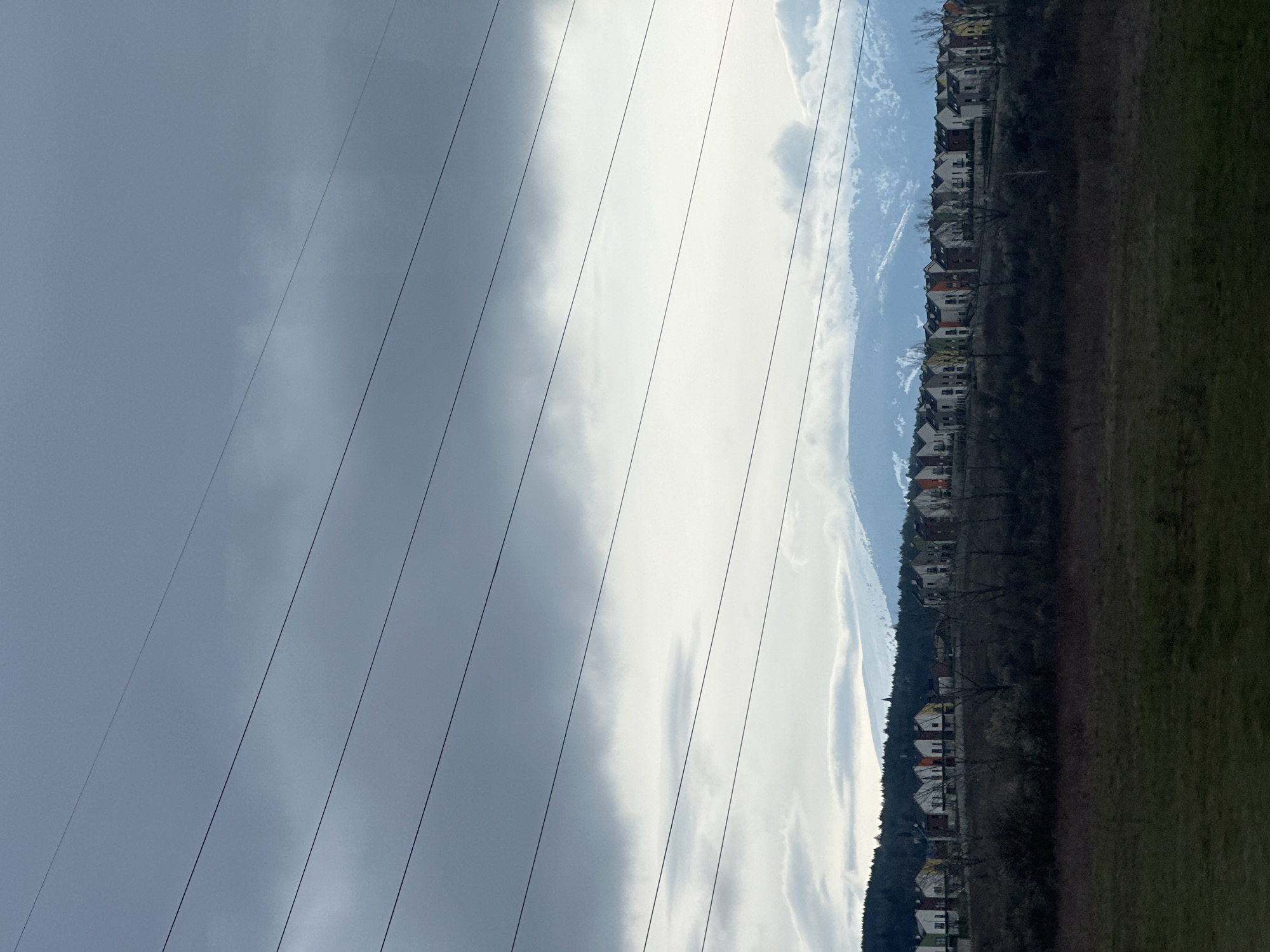 The image depicts a landscape scene. In the foreground, there are power lines stretching diagonally across the frame. To the right, there is a line of houses with various roof colors, positioned on a rise of land. Beyond the houses, there appears to be a field. The sky is cloudy with varying shades of gray and white. The location is Lozen, Bulgaria.