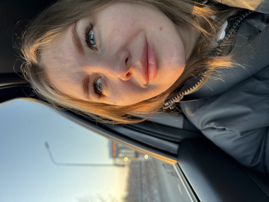 A blonde female is depicted from the chest up, seated within a vehicle and gazing upwards and to her right, out the passenger window