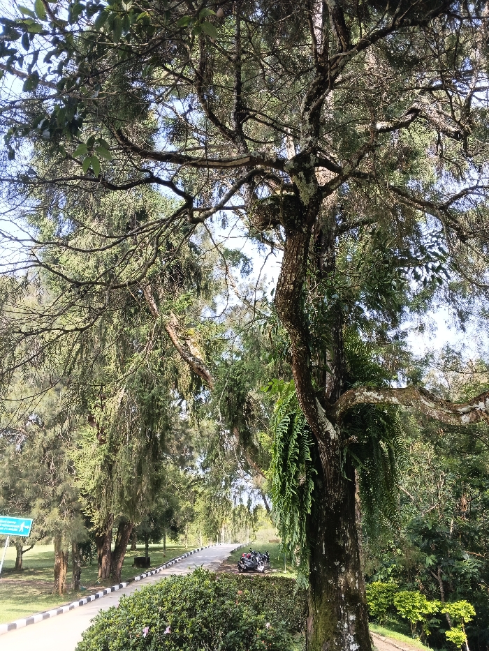 A winding road bordered by lush greenery leads to a glimpse of parked motorcycles. Tall trees dominate the view, their branches adorned with ferns and moss, creating a shaded canopy. A blue signpost stands to the left, partially obscured by leaves. The scene evokes a sense of tranquility and nature's embrace along the roadside.