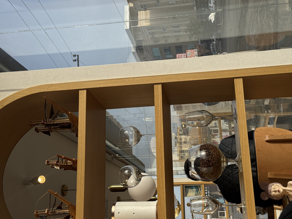A brightly lit interior space shows a display shelf with wooden dividers. On the left, sailboat models are mounted on a white wall, illuminated by a light. Clear wine glasses are suspended horizontally, some filled with coffee beans. A white spherical object sits in one compartment. Beyond the shelf, a window reflects a building exterior. The ceiling above features glass panels. A doll is partially visible on the right side of the shelf.
