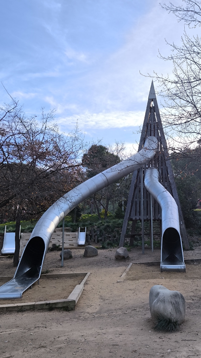 The image displays an unoccupied outdoor playground situated in Cerdanyola del Vallès, Spain. The central element is a tall, pyramid-shaped wooden structure, acting as a support for two prominent, curved, tubular metal slides. The slide on the left is longer and terminates in a sandpit, while the slide on the right is shorter and also concludes in a sandpit. In the background, to the left, two additional smaller, open-trough metal slides are visible on a tiered wooden platform. The ground consists primarily of compacted dirt and sand, with several natural rocks scattered across the area. Numerous deciduous trees with bare branches are present, suggesting a non-foliage season. The sky is light blue with scattered wispy white clouds. No individuals are visible in the scene.