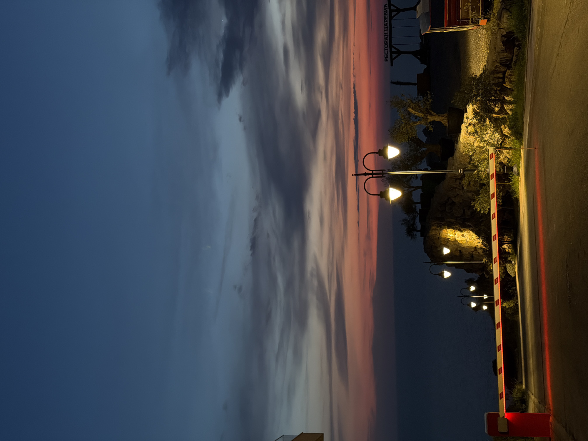 The image depicts a twilight scene at Kovačko Polje, Montenegro, overlooking the sea during sunset. A red and white striped barrier arm is in the foreground, extended horizontally, blocking a paved access road. The barrier housing on the left is red, and a red light is emitted from the barrier arm, reflecting on the tarmac. Several double-headed streetlights are illuminated along the curving road and rocky terrain to the right, casting a warm yellow glow. Mature olive trees, some in large pots, are visible among the rocks and foliage. In the background, the Adriatic Sea extends to the horizon beneath a sky transitioning from deep blue overhead to vibrant oranges, reds, and purples at the horizon, with scattered dark clouds. To the upper right, a sign with Cyrillic text "РЕСТОРАН ЦАРЕВИЋ" (RESTORAN CAREVIĆ) is discernible, suggesting a restaurant. Below the sign, a wooden structure, possibly a swing set, is present. A portion of a modern building with a glass railing is visible on the far left. The scene is devoid of human presence or active vehicles.