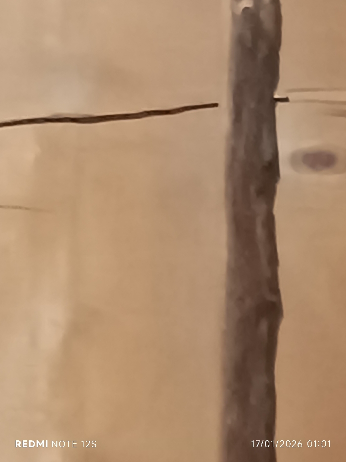 A close-up depicts a light brown wooden surface with a vertical post or beam running along the right side of the image. A thin, dark horizontal line intersects the post. A knot or imperfection is visible on the right side, near the middle of the image. Text on the bottom left reads "REDMI NOTE 12S" and text on the bottom right reads "17/01/2026 01:01".