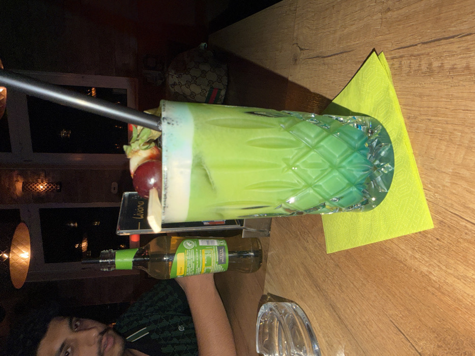 The scene depicts an indoor setting within the Liviana restaurant/lounge in Ulm, Germany, during dim lighting conditions, indicative of evening or night. A tall, faceted glass containing a layered cocktail, transitioning from vibrant green to a deeper blue at the base, occupies the central foreground. The drink is topped with white foam, a black drinking straw, and a garnish skewer featuring a red cherry, a physalis (cape gooseberry), and a light-colored fruit slice. The glass rests on a neon yellow napkin positioned on a light-colored wooden table. To the left of the cocktail, a clear glass ashtray is partially visible on the table. Further left, a male individual's head and upper torso are visible, with dark hair and facial hair, looking directly towards the camera. He wears a dark, patterned shirt. His left forearm rests on the table. Behind the ashtray, a green-labeled glass bottle stands upright. Behind the cocktail, a clear menu or sign holder displays the name "Liviana" in white text. In the background on the right, a brown bag with a repeating pattern, consistent with Gucci branding, is partially visible. The background also reveals dark windows and decorative light fixtures mounted on the walls.