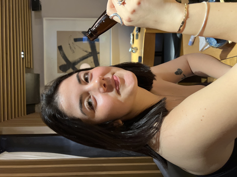 A woman poses with a playful expression, her dark hair framing her face. She holds a brown glass bottle above her head. A rose tattoo is visible on her upper arm. The woman is wearing two bracelets and a ring. The background includes a neutral-toned painting with black abstract designs, wooden slats, and glimpses of furniture. The lighting is soft.