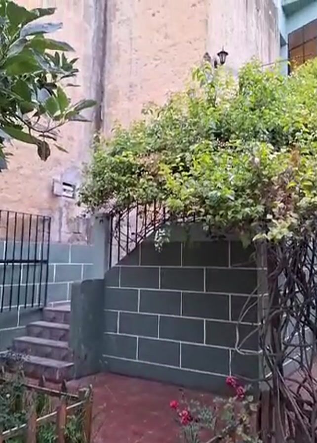 The video starts with a shot of a small enclosed garden area with a gate and brick walls, leading to steps