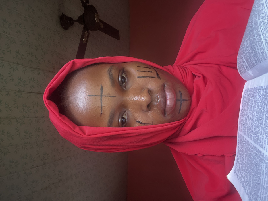 This image captures an individual in an indoor setting in Ado, Nigeria. A dark-skinned adult female, positioned centrally, gazes directly at the camera. She wears a solid red head covering that frames her face and a matching red garment. Her face is marked with black symbols: a cross on her forehead, multiple vertical lines on her left cheek, and a cross on her chin below her lower lip. A small silver stud is present in her right nostril. She holds an open book with densely printed text, visible in the lower portion of the frame. The background consists of a solid red wall and a light-colored ceiling featuring a subtle, patterned motif. A dark-colored ceiling fan with multiple blades is mounted on the ceiling in the upper right quadrant.