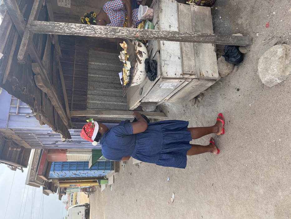 The image depicts a daytime street scene in Ngleshi Amanfro, Ghana. In the foreground, a woman stands with her back partially to the viewer, facing a street vendor stall on the right. She wears a blue denim short-sleeved dress, a red Santa hat with white trim and green festive decorations, and red slide sandals. Her left arm is slightly bent, and she appears to be interacting with the stall. To her right, a makeshift vendor stall is constructed from raw wooden planks and corrugated metal sheeting, topped with a weathered corrugated metal roof supported by wooden posts. Within this stall, a second woman is visible on the right side, wearing a patterned top and having yellow hair rollers in her dark hair. She is attending to food items on a wooden counter. On the stall's counter, a metal grill holds several pieces of food, likely plantains or yams, positioned above a metal basin. Nearby, clear plastic containers hold small, light-brown food items, possibly groundnuts, and a black plastic bag rests on the counter. Another black plastic bag is on the ground near the stall's base, alongside a large rock. The ground consists of light-colored dirt and gravel, with scattered small pieces of refuse. In the background, a row of similar, brightly colored corrugated metal structures, likely additional stalls or shops, lines the unpaved street. A white van is visible parked further down the road on the left. The sky is overcast.