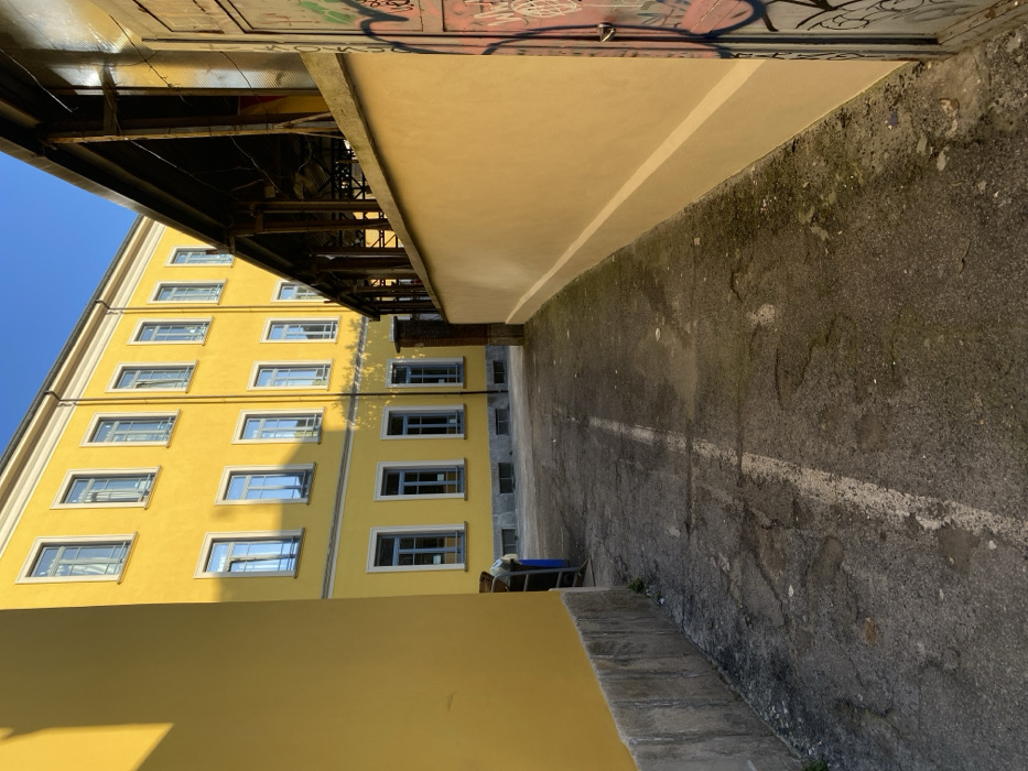 The scene depicts an outdoor alleyway or narrow courtyard adjacent to the Istituto Tecnico Industriale Statale Feltrinelli in Milan, Italy, observed under clear daylight conditions. To the left, a bright yellow three-story building facade with multiple evenly spaced rectangular windows, featuring light blue frames and white sills, receives direct sunlight on its upper sections. A portion of a smaller yellow wall with a gray stone base extends into the foreground on the left, partially obscuring a blue and gray waste bin. To the right, a curved, pale yellow wall extends from the foreground towards the background, topped by an older, covered walkway structure characterized by exposed dark wooden beams and a translucent corrugated roof. A metal door on the far right, covered in multi-colored graffiti including red, pink, black, and white markings, frames the edge of the image. The ground is an uneven, dark asphalt surface exhibiting cracks, wear, and patches of dirt, with a faded white painted line running longitudinally down its center from the foreground into the midground. No individuals are present.