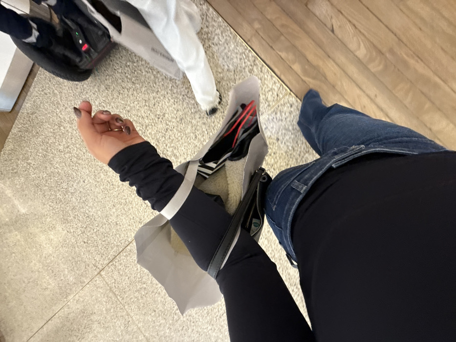 A high-angle photograph captures a scene within an indoor commercial establishment in Saint-Laurent-du-Var, France. The primary subject, seen from the waist up to the forearm, is wearing a dark long-sleeved garment and blue denim jeans. The subject's right forearm, featuring manicured nails with dark polish and a gold-colored ring on the ring finger, holds a light gray paper shopping bag with white handles. Inside the bag, dark objects with red elements and white packing material are visible. A small black zippered pouch is positioned on the subject's left thigh, partially obscured. The floor in the foreground is composed of light-colored, speckled tile, transitioning to light brown wooden floorboards in the mid-ground, separated by a thin metallic strip. In the background, to the right, are the lower legs of a second individual wearing white trousers and dark shoes, positioned near a black self-balancing scooter (possibly a Segway or hoverboard) which displays illuminated red and green indicators. A second white shopping bag is partially visible near the second individual's legs.