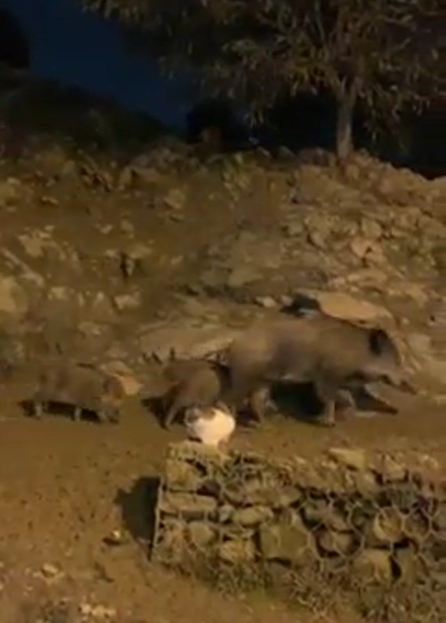 - "At night, a small group of wild boars emerges near a rock barrier, with an adult followed by several younger ones" by FM-Gn7EC2, licensed under CC BY 4.0