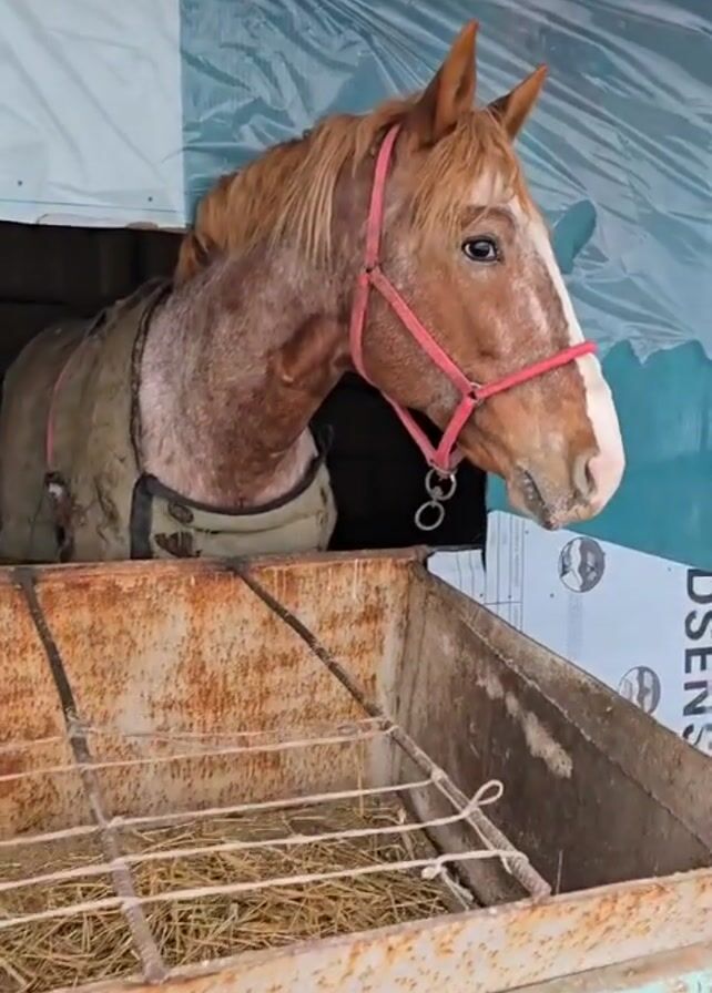 horse standing in a stall. The horse is light brown with a white blaze on its face. It is wearing a red halter and a green blanket. The stall is made of corrugated metal and wood. There is a metal feeder in front of the horse, which contains hay. The horse is looking to the right of the camera.