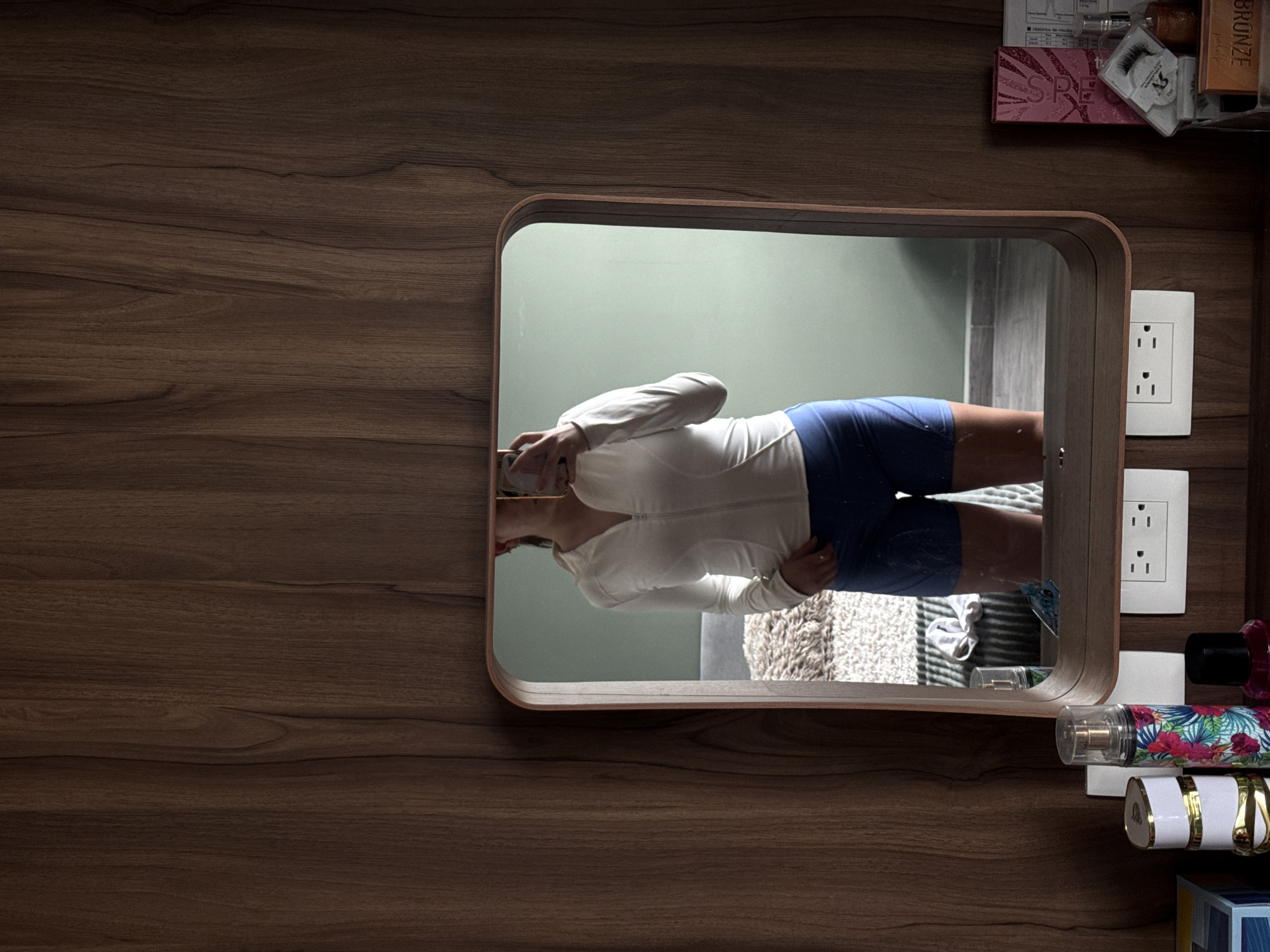 An individual is depicted taking a selfie in a rectangular mirror with rounded corners, located in San Bernardino Tlaxcalancingo, Mexico. The mirror is framed in light-colored wood and affixed to a dark brown, vertically paneled wooden wall. The individual, from the upper chest to the mid-thigh, is reflected wearing a white long-sleeved quarter-zip top and dark blue form-fitting shorts. A smartphone, light-colored, is held up to the individual's face, partially obscuring it, indicating the act of photography. Below the mirror, two white duplex electrical outlets are mounted on the wooden surface. A wooden vanity or dresser top extends from the base of the mirror. Arranged on the dresser to the left are a gold and white cylindrical object, a transparent spray bottle with a tropical floral pattern (pink, green, blue), and a small blue and white patterned box. To the right, various cosmetic items are visible, including a pink makeup palette, a clear package of false eyelashes, a small brown box labeled "BRONZE," and other assorted bottles and containers. The reflection in the mirror reveals a room with light green walls and a floor composed of light gray tiles. A section of a bed with a textured, fluffy white or light brown comforter is visible in the background, along with what appears to be a gray headboard or cushion. No other individuals are present.