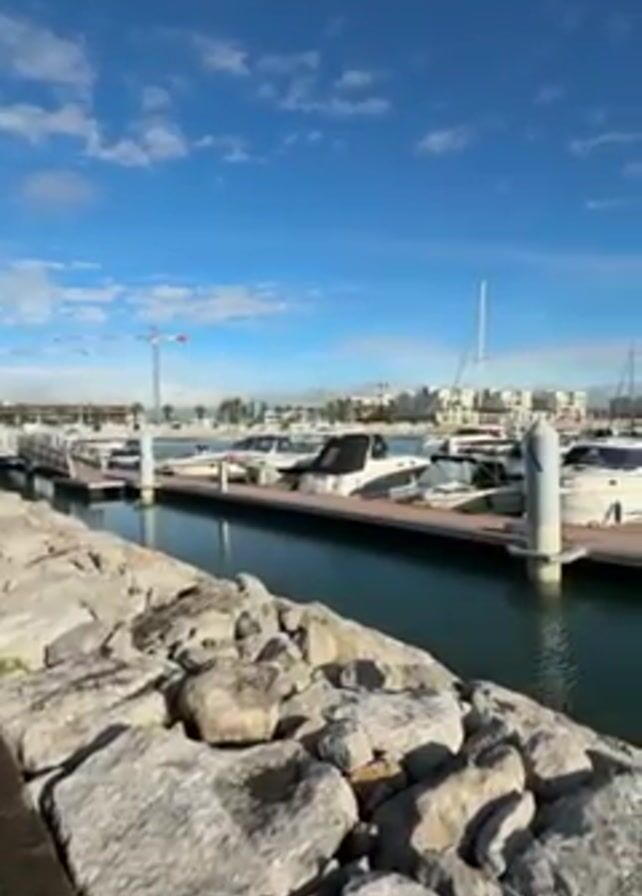 marina on a sunny day with a partly cloudy blue sky. The camera is positioned behind a rocky breakwater, looking out over a harbor filled with boats docked at floating piers. The boats vary in size and type, from smaller motorboats to larger yachts, some with sails. In the background, there are white buildings, potentially apartments or commercial properties, lining the harbor. The water in the marina is calm and reflective, and the overall scene conveys a sense of tranquility and leisure. There are no people visible in the frame.