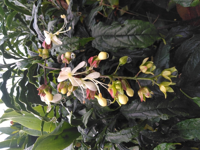 The image depicts a flowering plant species in the city of Chan-Nua, Laos. A central stem exhibits a pendulous cluster of developing buds and open flowers. The open flowers are white to creamy-white with distinct elongated stamens. Numerous buds, varying from light yellow to reddish-green, are visible in various stages of development along the stem. The foliage consists of dark green, textured leaves. Multiple clear water droplets adhere to the petals, buds, and leaf surfaces. No human presence or other subjects are discernable.
