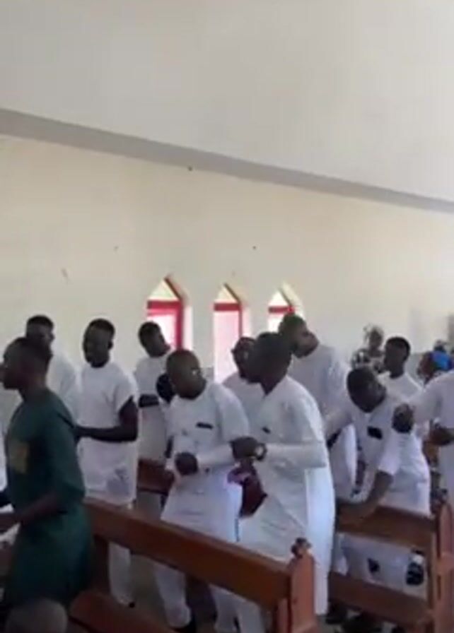 Inside a brightly lit church, a group of men, mostly dressed in white outfits, are actively dancing and celebrating between and around the pews