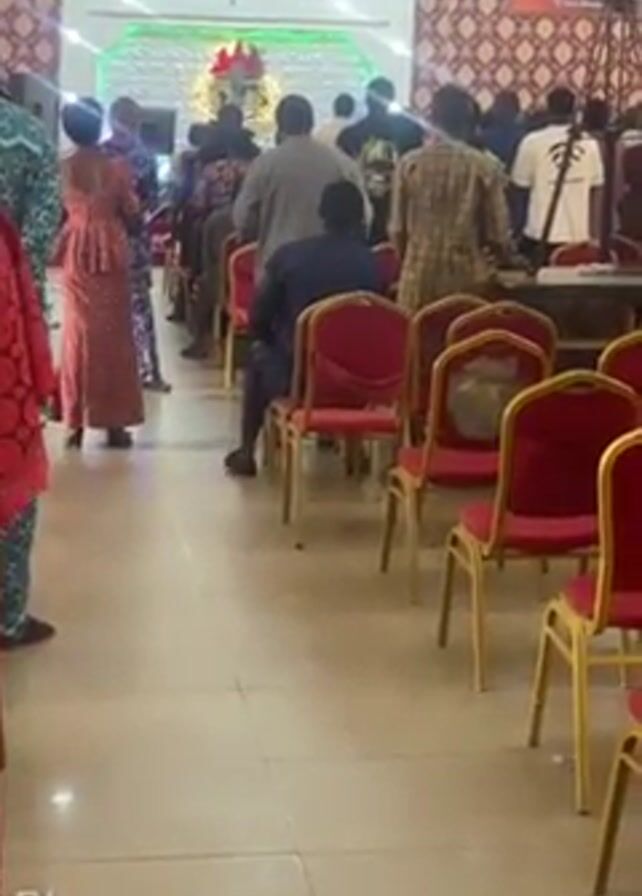 gathering of people inside what appears to be a church or auditorium. People are milling about, standing, and sitting in rows of red chairs. Some are dressed in formal or traditional attire. A stage area is visible in the background, with a sign that says "OPEN DOOR." A screen above the stage displays text, potentially lyrics or announcements. The overall impression is that this is either a pre-service or post-service gathering, or perhaps an intermission.
